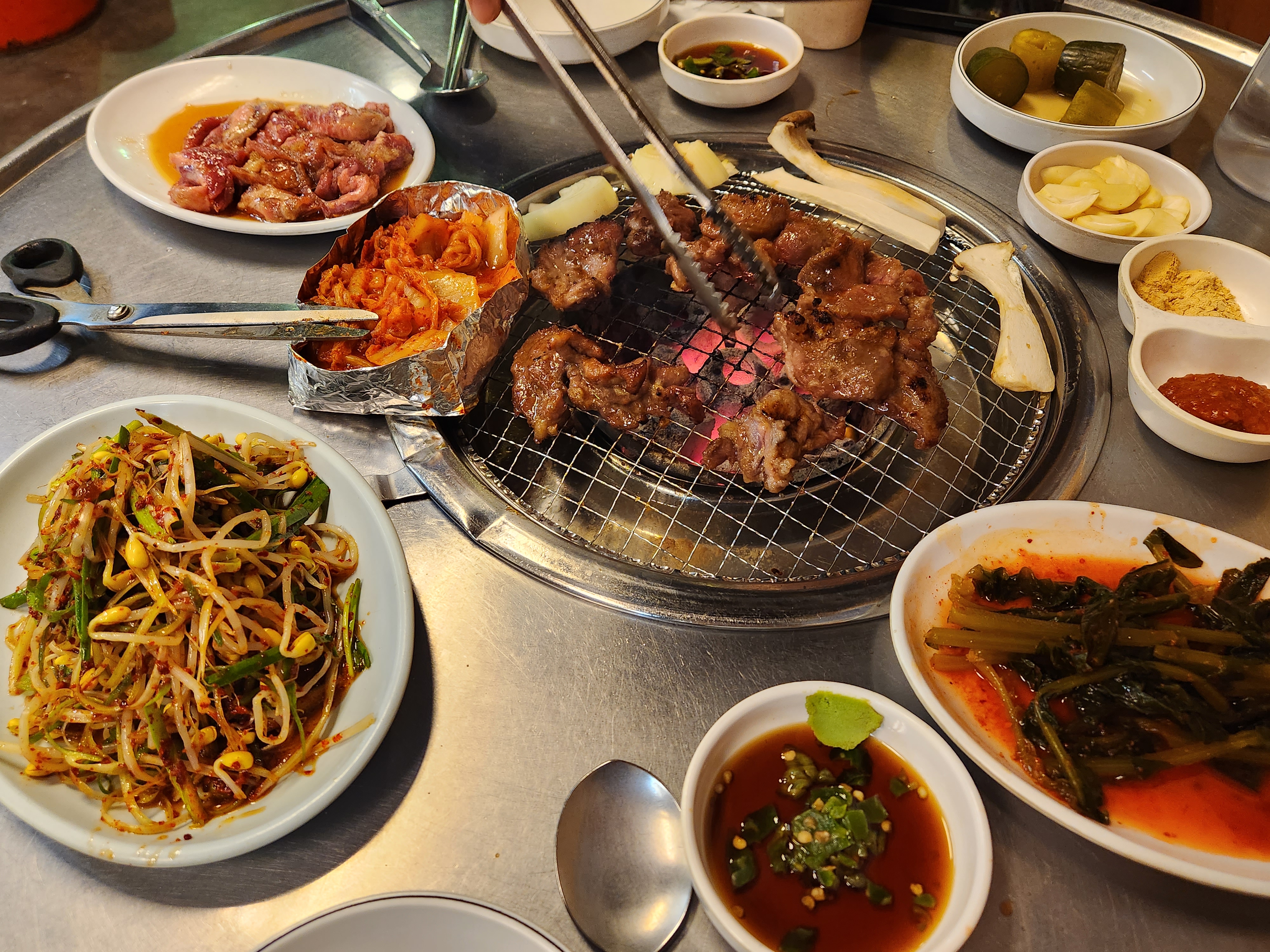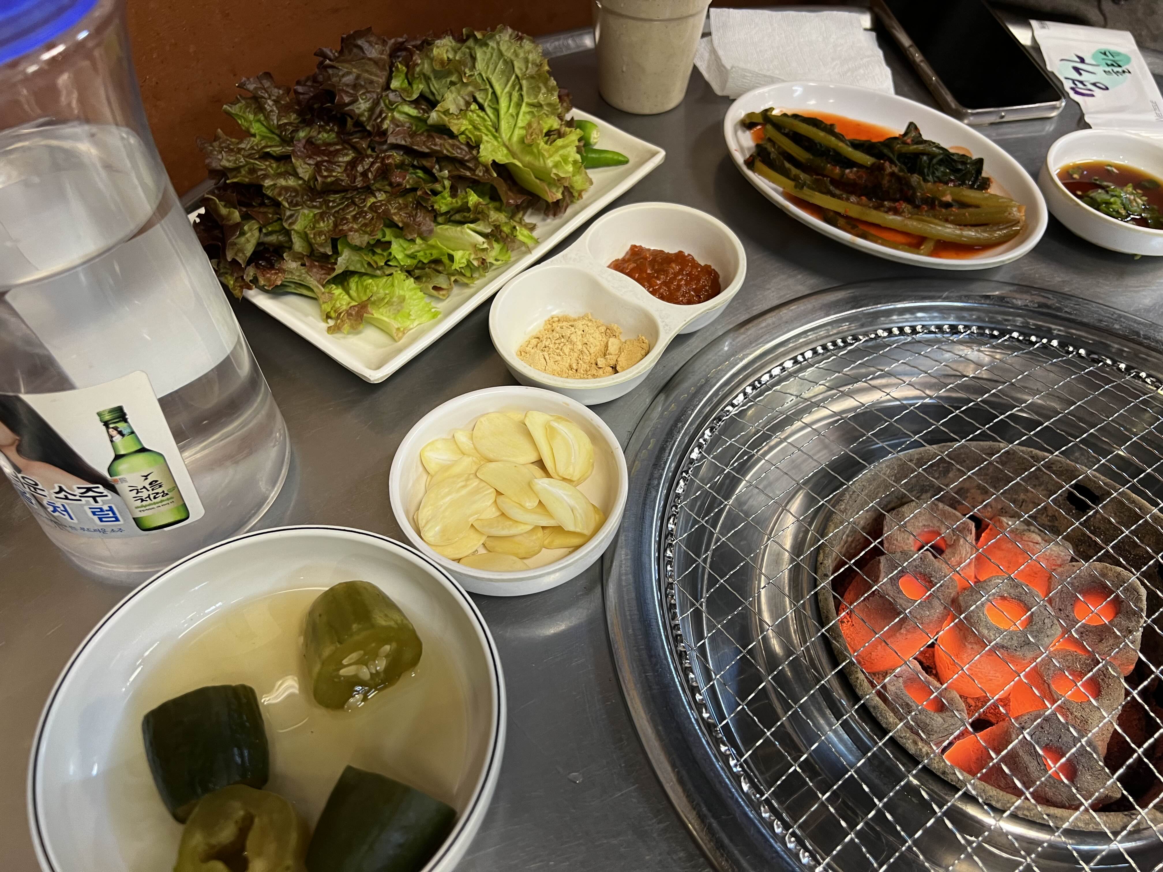 파채와 쌈채, 명이나물이 인상적이다, 고기를 주문할때마다 나오는 버섯과 양파도 맛있다.
