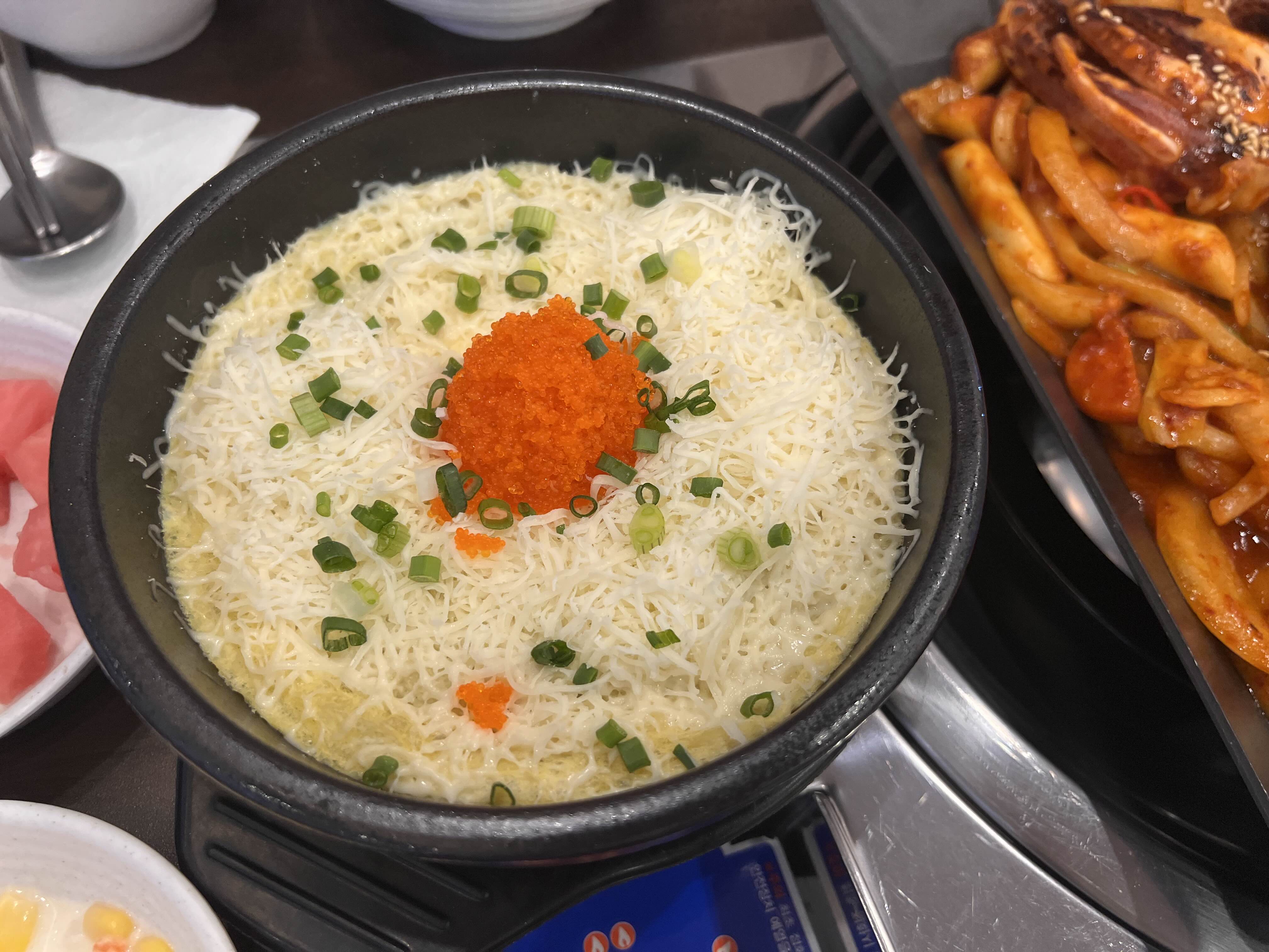 계란찜 위에 치즈+날치알이 데코되어있는데, 계란찜의 밀도가 낮지 않고, 진한 편이다.
