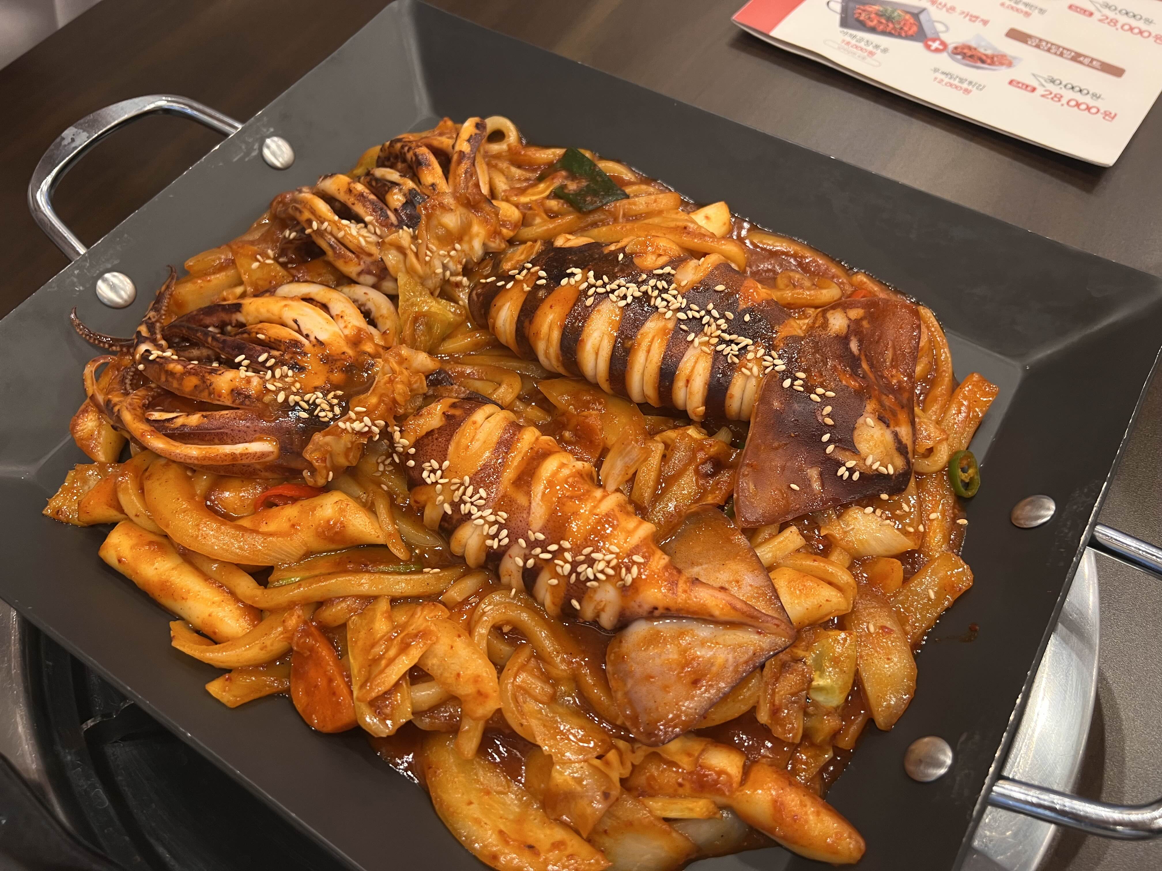 오징어 밑에 떡, 우동사리, 양배추, 양파등이 있는데, 탄수화물 + 단백질 조합이 좋다.