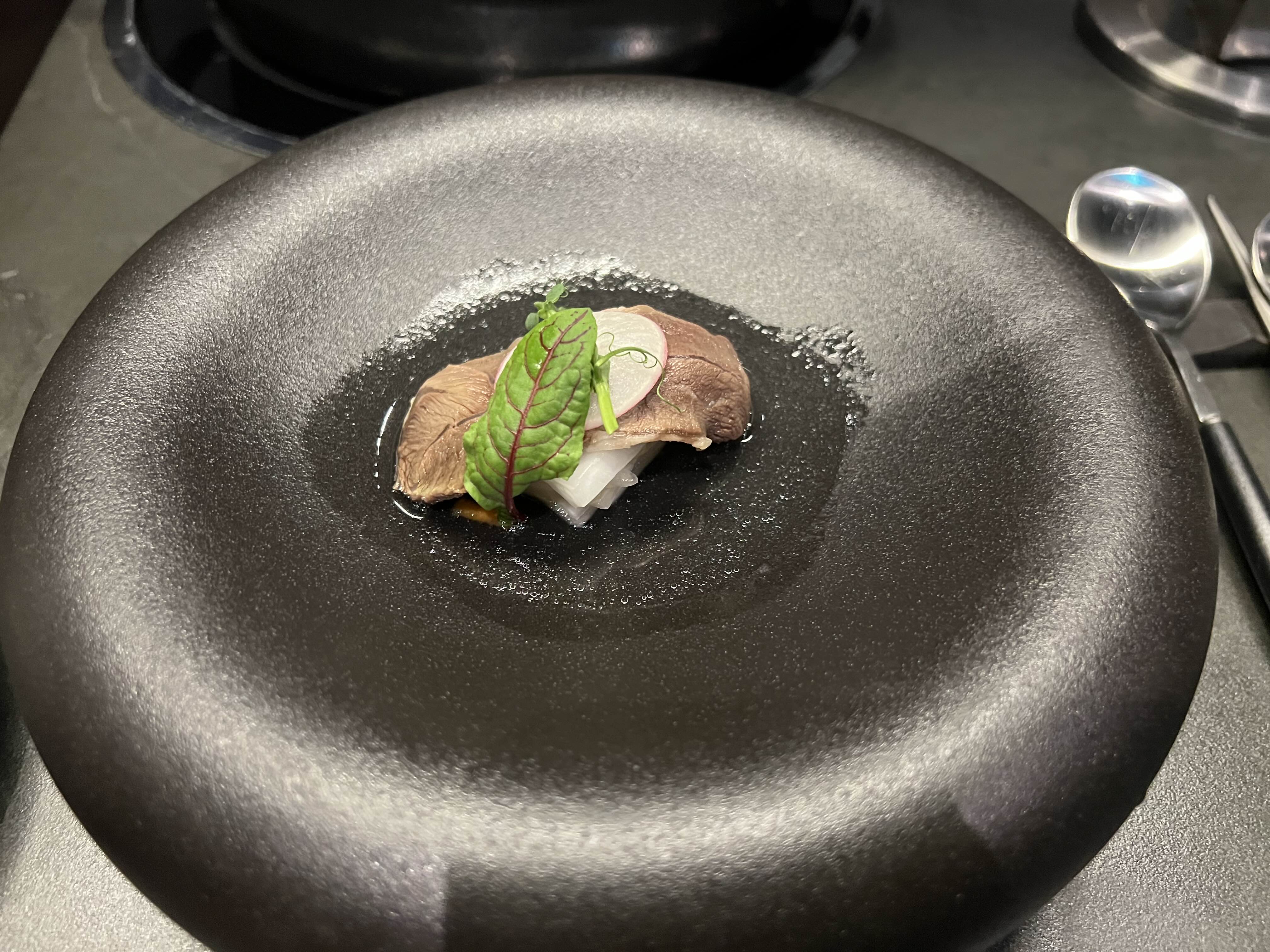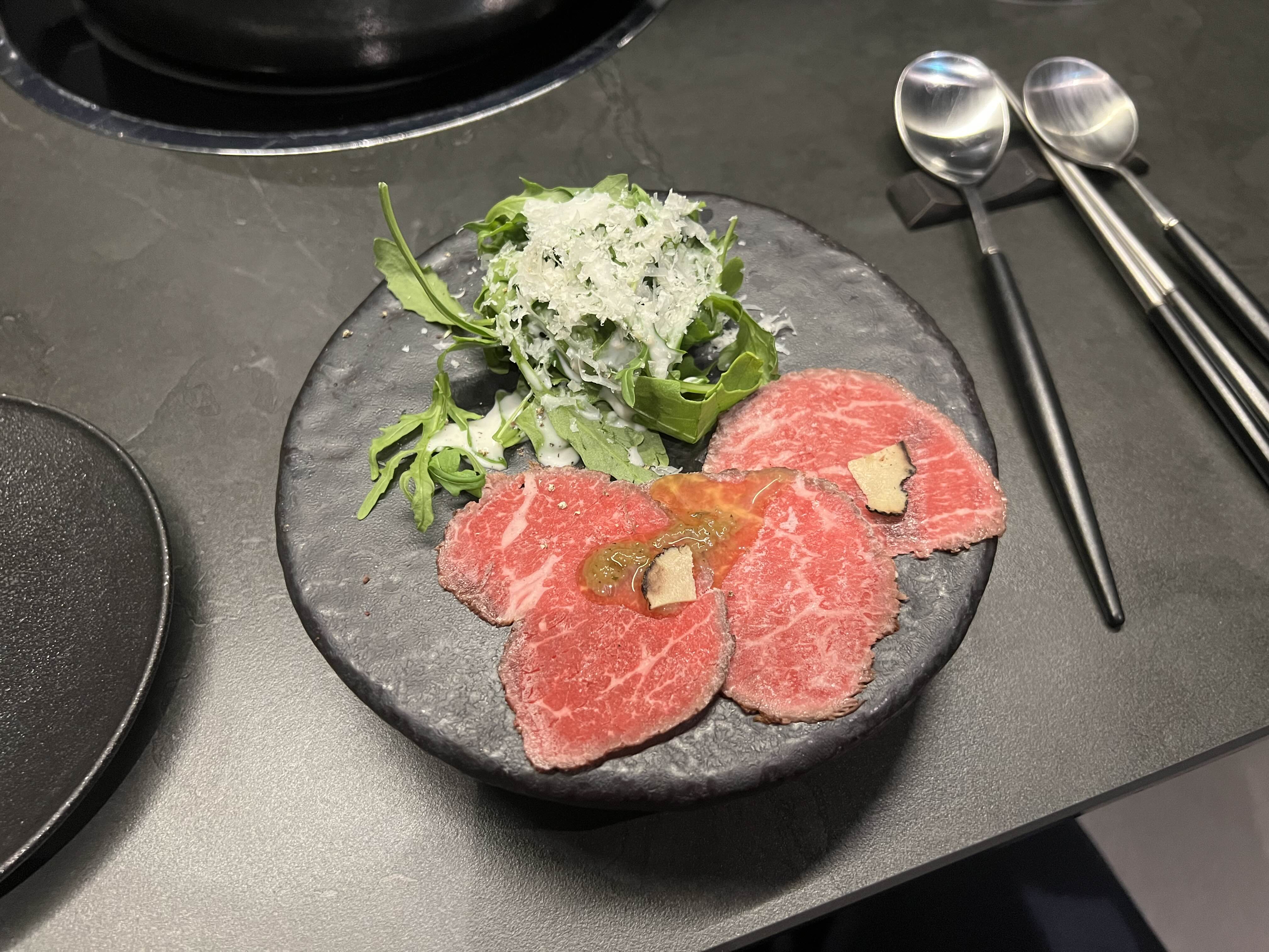숙성된 한우과 트러플, 루꼴라와 치즈가 곁들여져 있다.