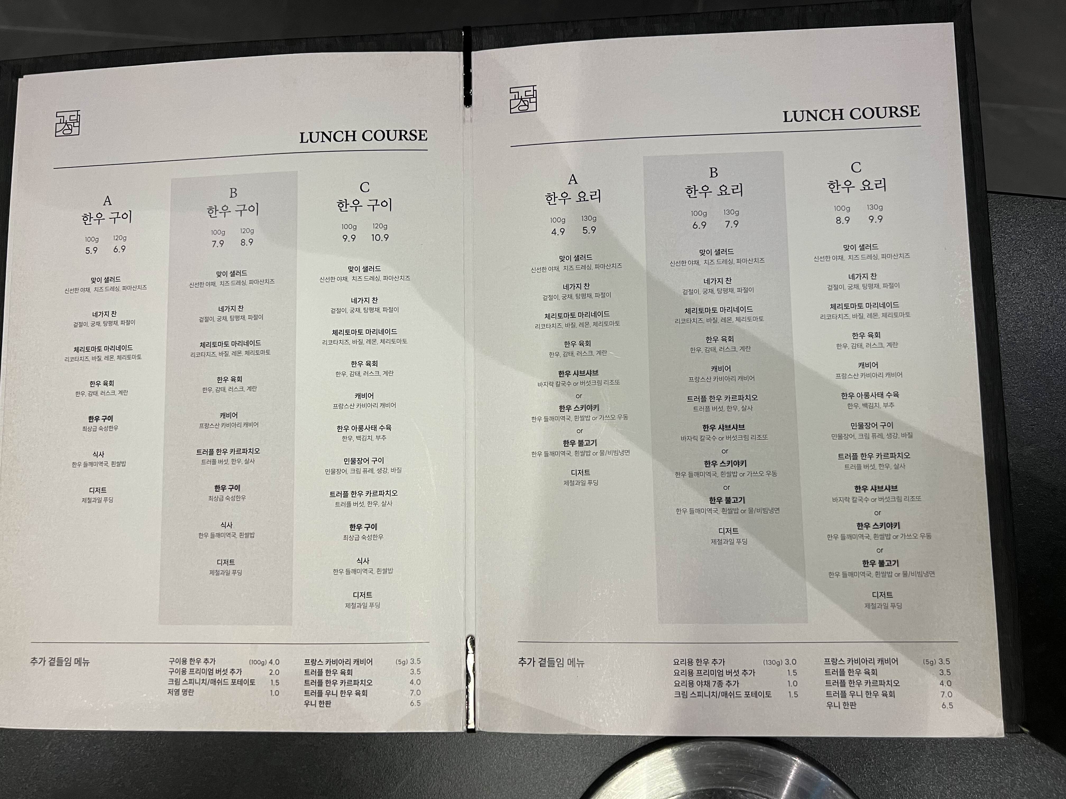 구이/요리 코스가 있고, 고기의 양을 선택할 수 있다.