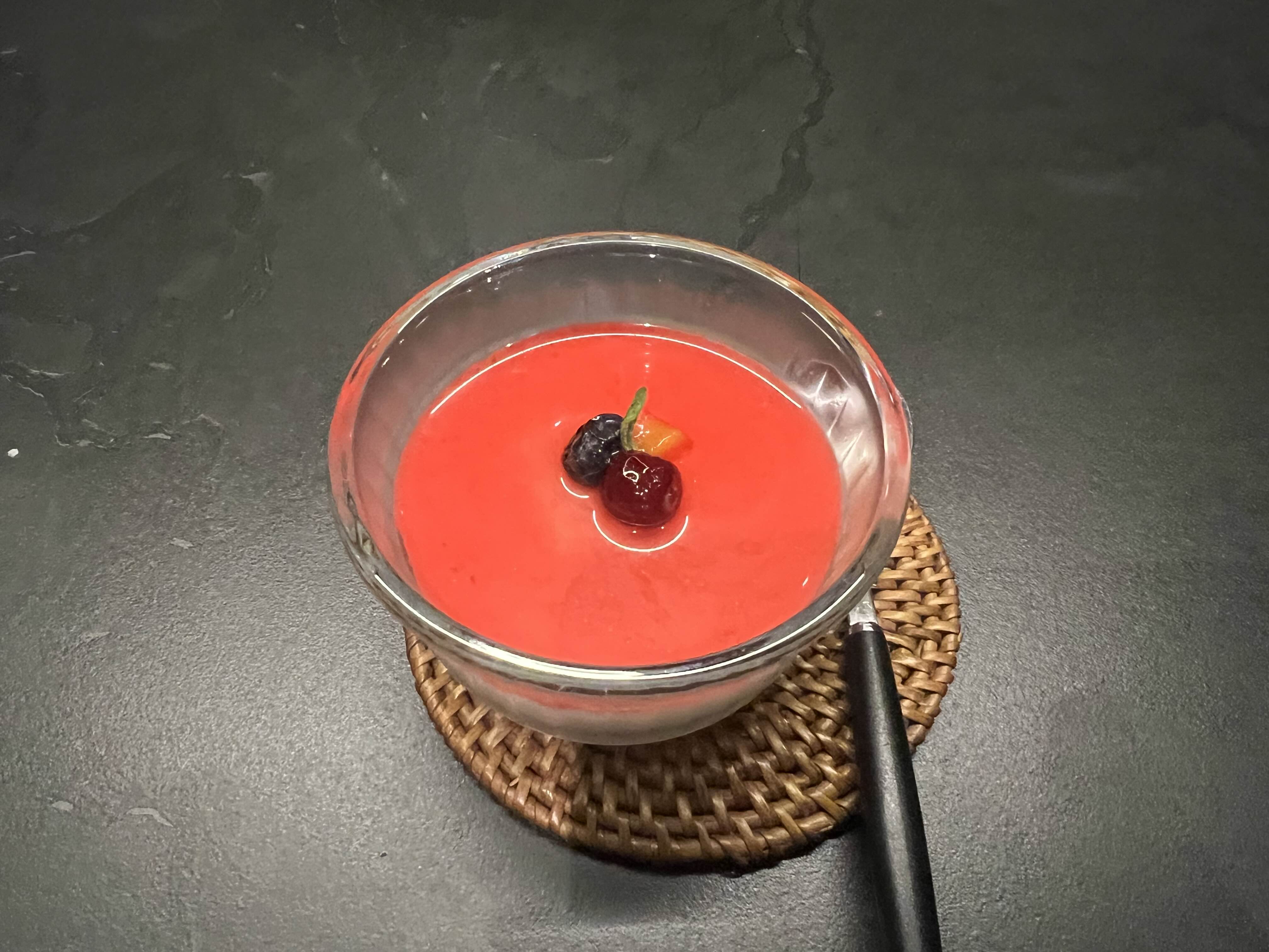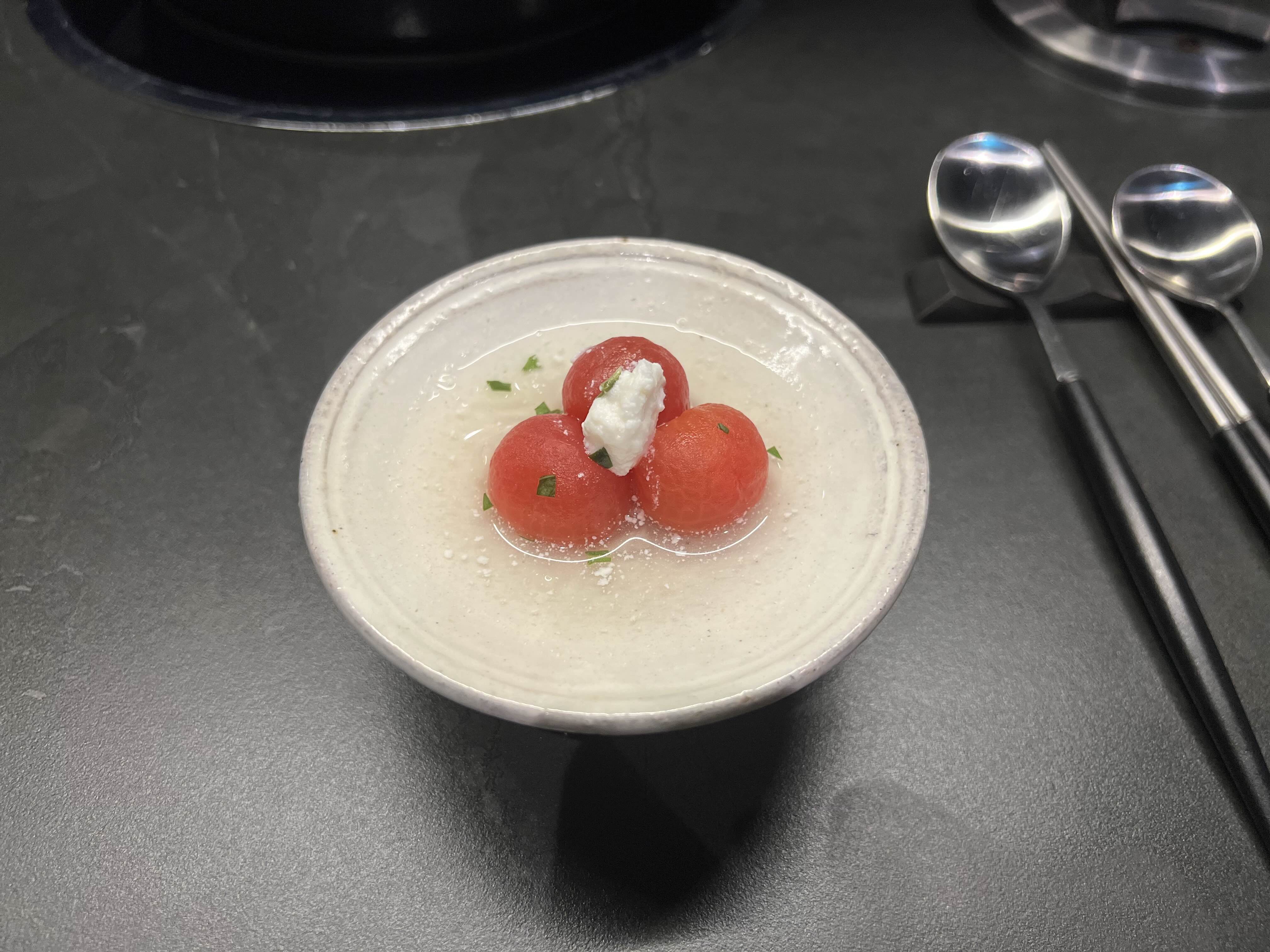 토마토 셔벗이고, 리코타 치즈가 곁들여져 있다.