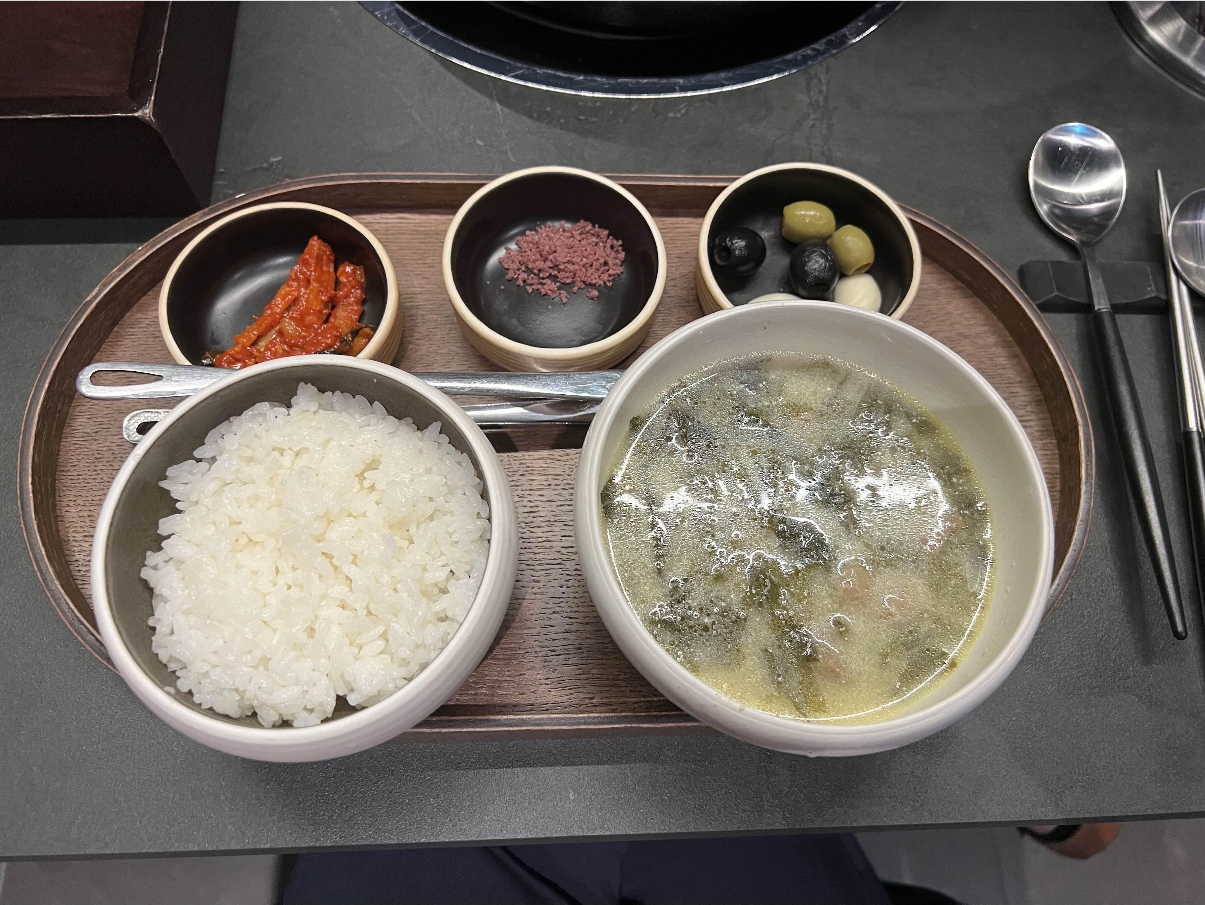 한우 들깨미역국과 밥이 나오며,