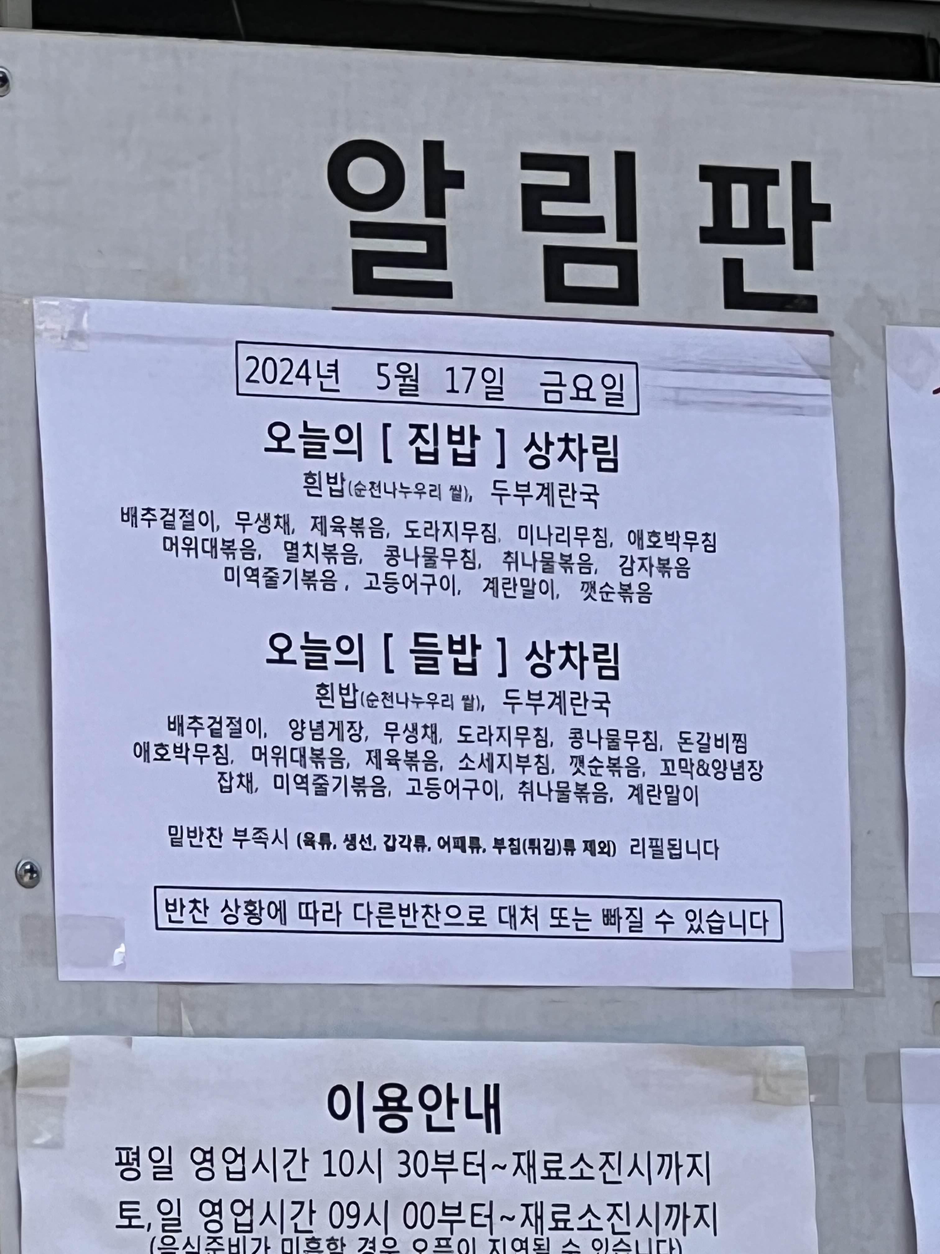 메뉴는 계절에 따라, 수급상황에 따라 일부 변경되며, 상세히 공지를 해주신다.