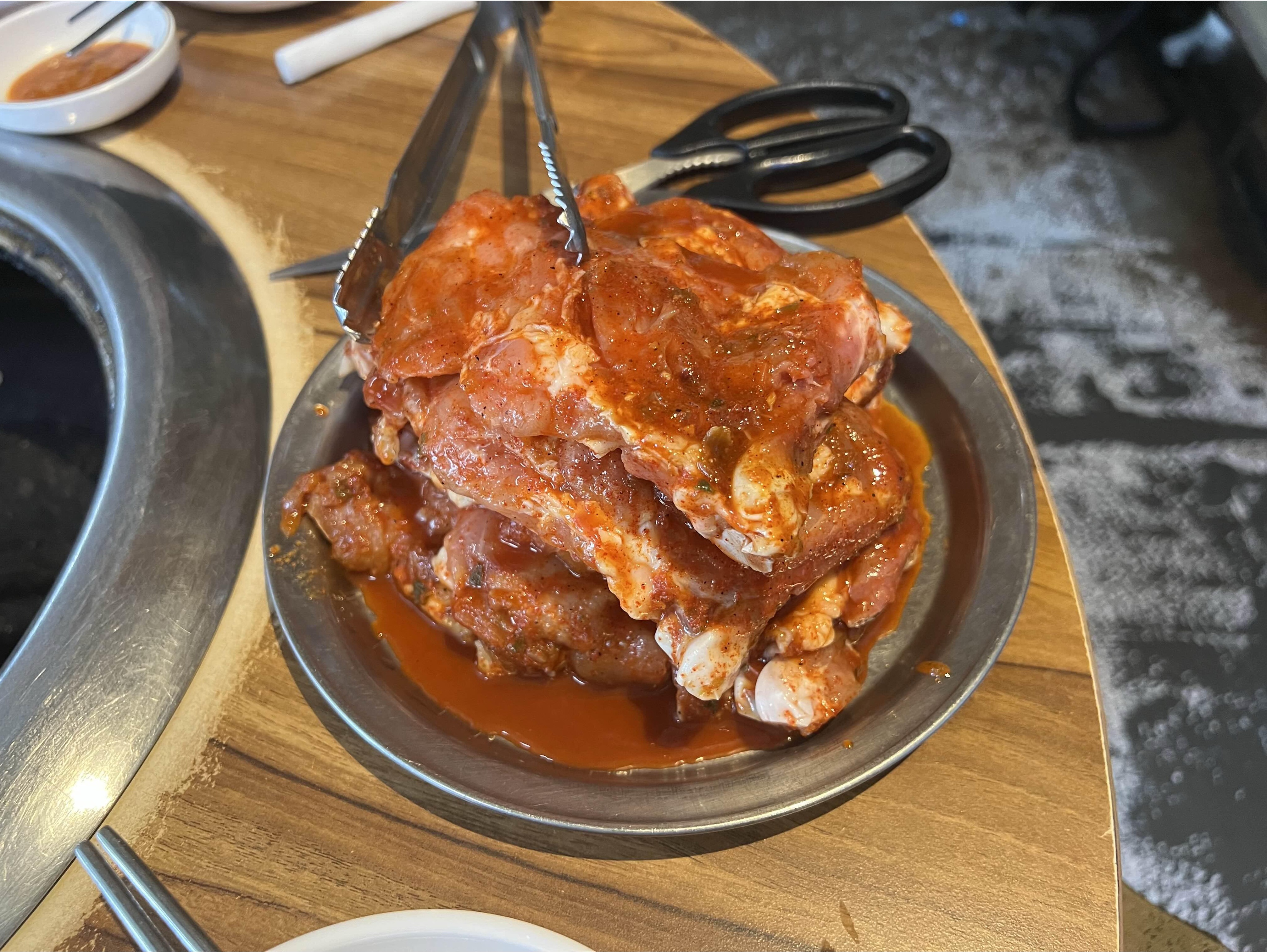 가지런히 놓여있는 닭갈비를 보며, 술한잔을 즐기기 좋고,