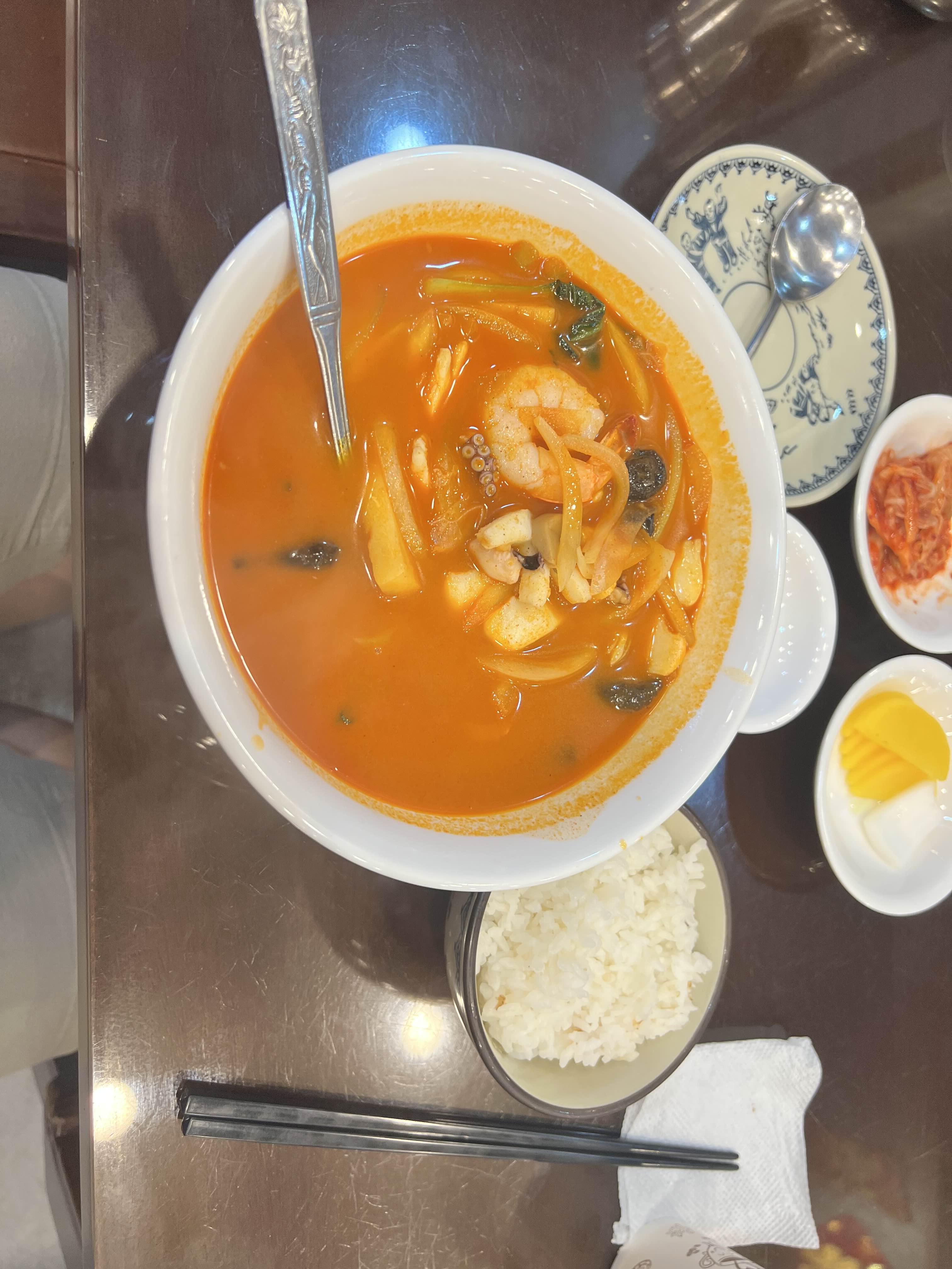 해물 베이스의 깔끔한 맛이며, 각 건더기들이 상당히 실하다. 고추가 보이지만 맵진 않고, 해물 육수의 비린 맛을 잡아주기 위해 넣은 듯 하다.