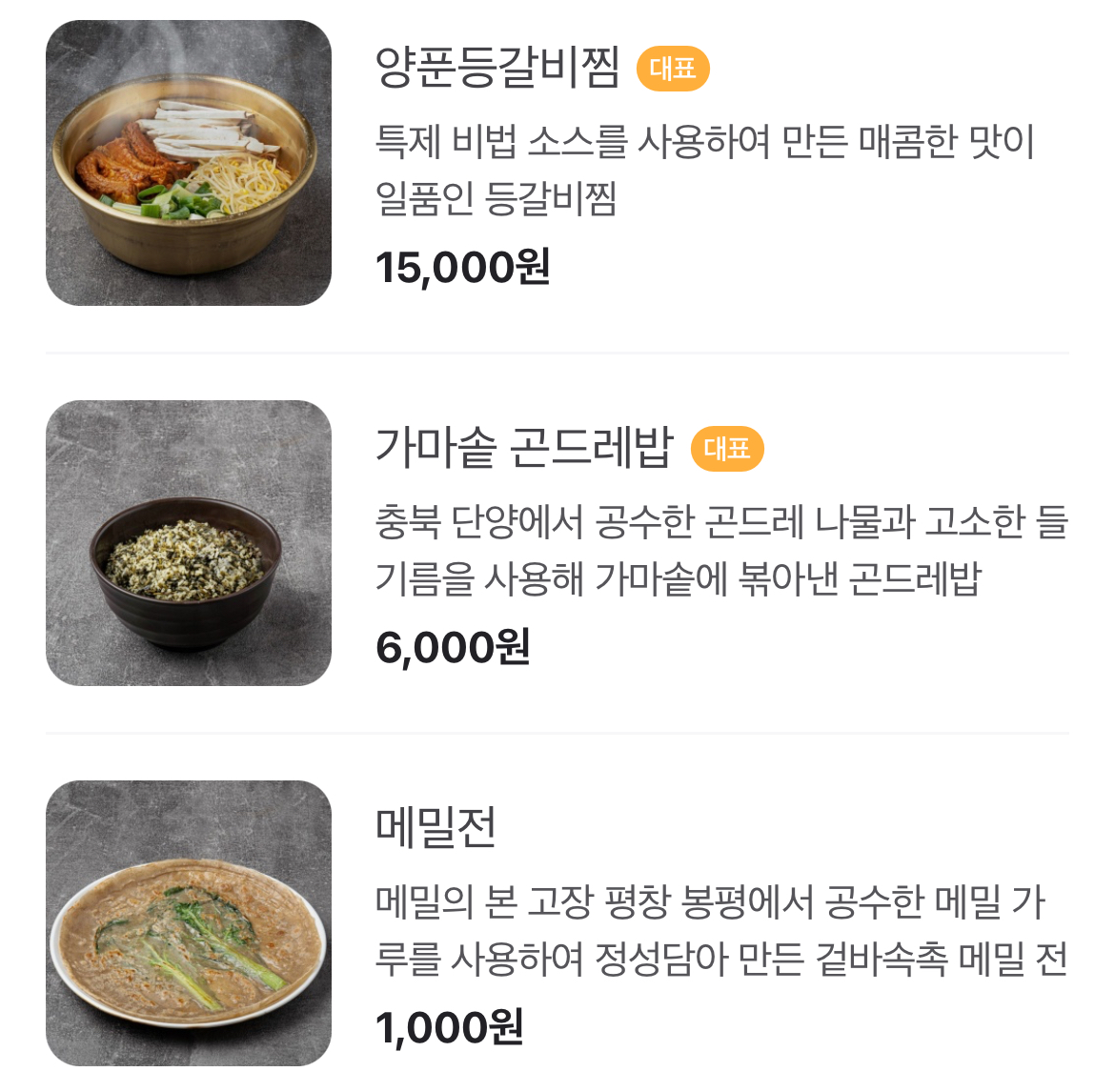 메밀전과 등갈비찜을 주문했고, 둘다 맛있게 먹었다. 종업원분들은 시원시원하게 안내 및 응대를 해주었다.